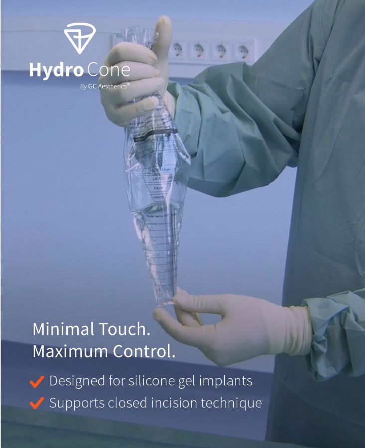 O Hydrocone é um funil de inserção utilizado para colocar a prótese de silicone com mais segurança e diversas outras vantagens. Esse dispositivo cirúrgico estéril (uso único) é usado em mamoplastias para guiar as próteses de silicone por pequenas incisões, garantindo a inserção sem contato direto da prótese com a pele da paciente ou as mãos do cirurgião, o que reduz drasticamente o risco de contaminação, minimiza o trauma tecidual, permite cicatrizes menores, aumenta a vida útil da prótese(implante) e melhora a segurança e o resultado estético do procedimento.